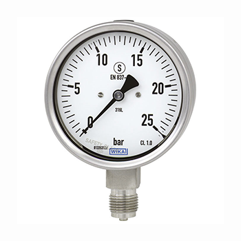 WIKA)根據EN 737-1歐洲標準“S3”安全版的要求制造并認證壓力表。安全型壓力表由非破碎窗口、測量系統(tǒng)和表盤之間的安全隔爆層和安全泄壓后蓋組成。如果發(fā)生故障,操作員在前側受到保護,介質或組件只能通過外殼背面彈出。