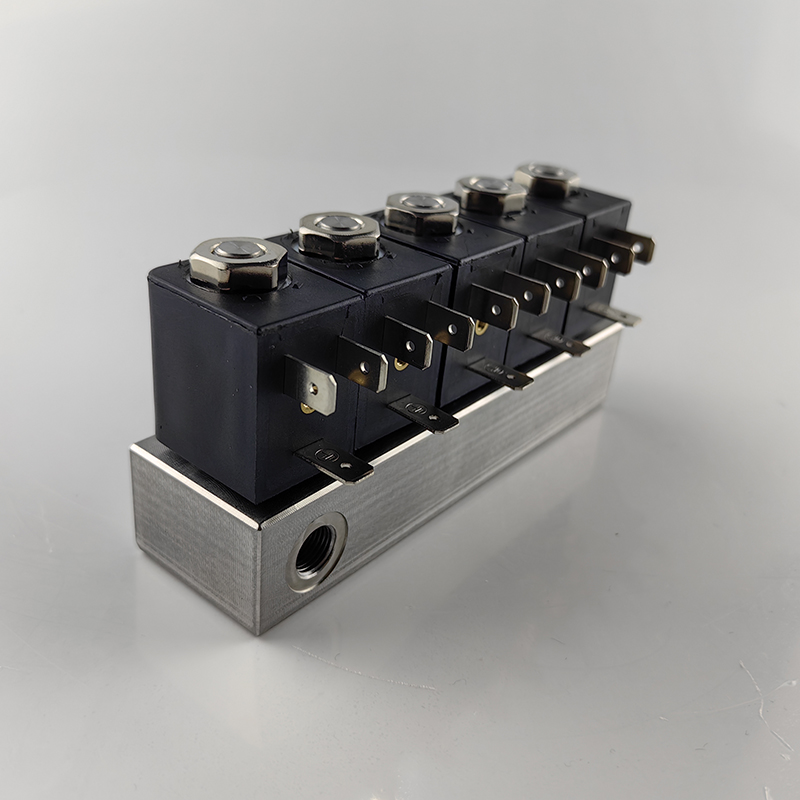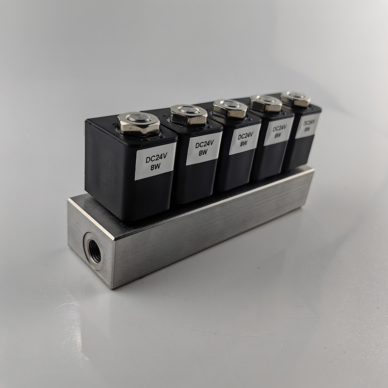 插針 飛線線圈,微型閥組兩通電磁閥切換1進(jìn)5出 5進(jìn)1出,集成閥到多進(jìn)多出,不銹鋼閥體。